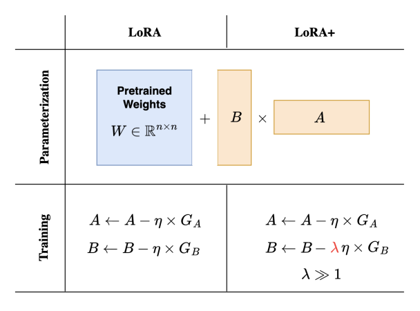 This paper proposes LoRA+ which improves performance and finetuning speed (up to ∼ 2X speed up), at the same computational cost as LoRA. The key difference between LoRA and LoRA+ is how the learning rate is set. LoRA+ sets different learning rates for LoRA adapter matrices while in LoRA the learning rate is the same.
