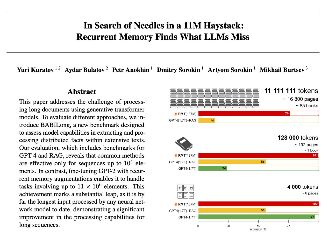 In Search of Needles in a 11M Haystack: Recurrent Memory Finds What LLMs Miss - Feb 21